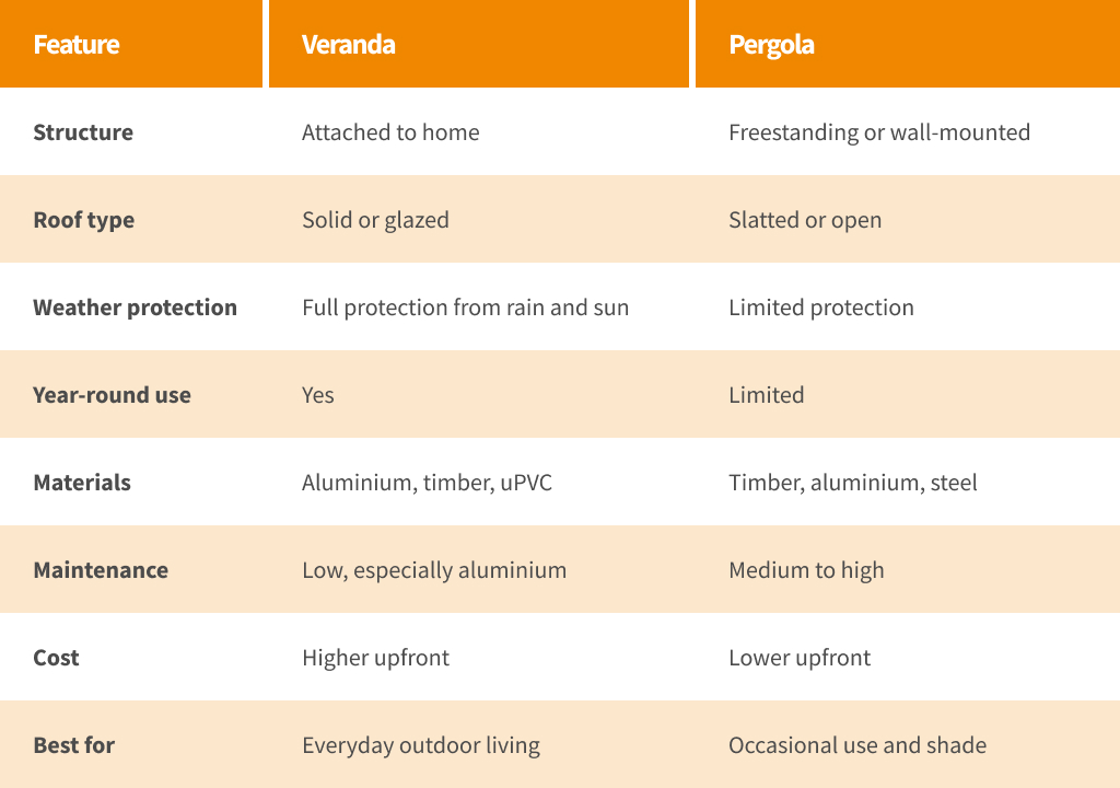 A covered structure will always get more use throughout the year. A pergola is better suited to occasional use, mainly during warmer and drier weather, whereas a veranda can be used comfortably in every season.